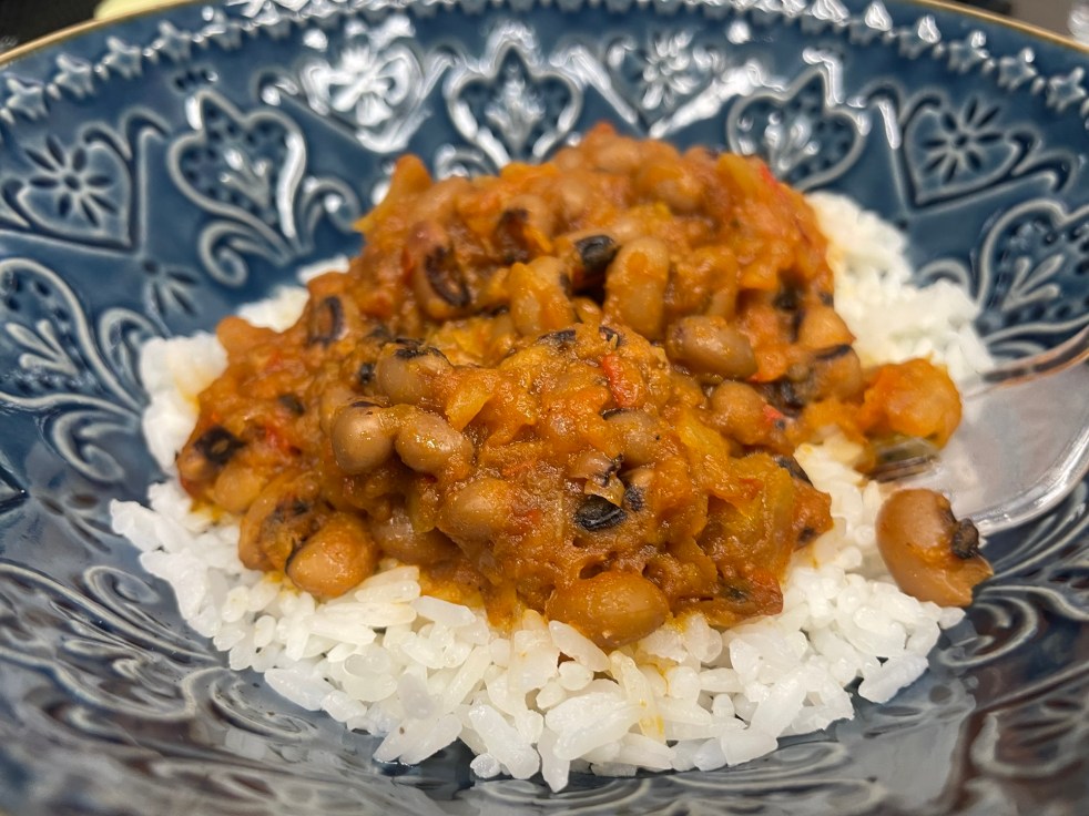 Some of my favorite meals are the ones that come together quietly — no measuring cups everywhere, no rushing, just cooking by feel and adjusting as I go. This vegan version of stewed black-eyed peas is one of those dishes.