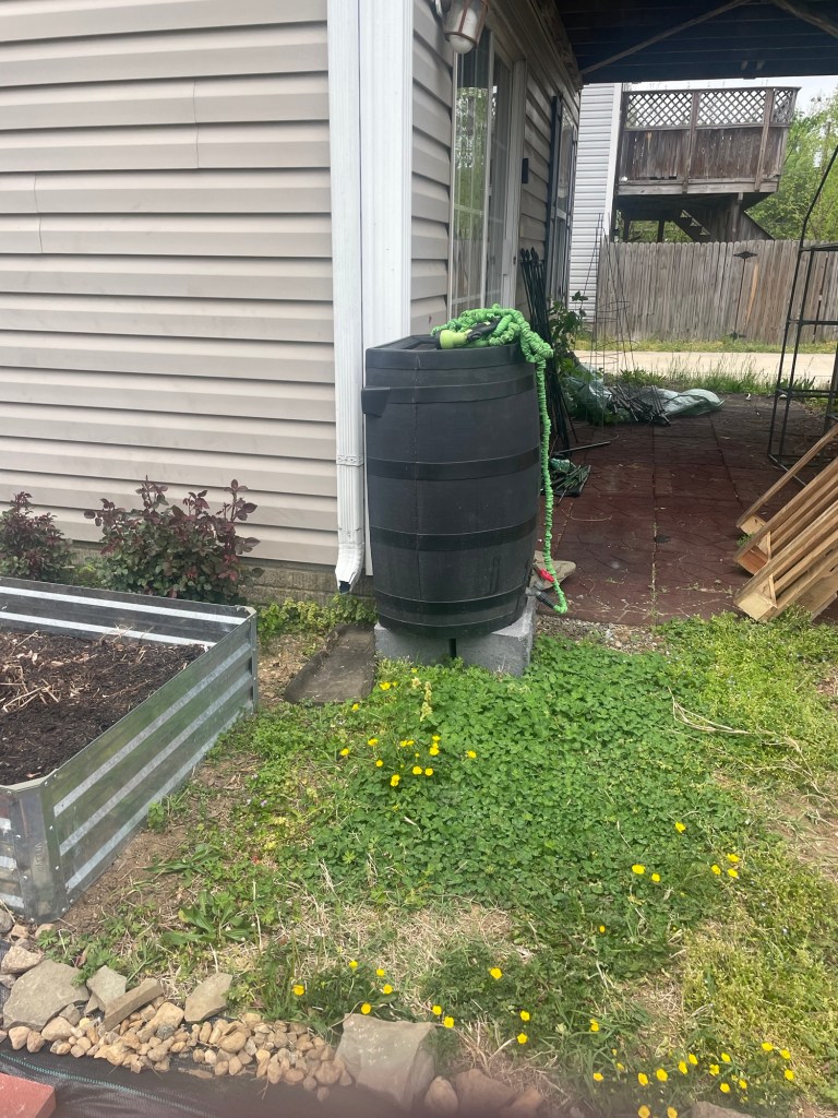 Before, it was sitting too low, which made it harder to access the water once it filled up. Elevating it has made collecting and using rainwater much more practical.